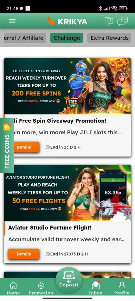 Krikya ক্যাসিনো ২০২২ সালের পর থেকেই বাংলাদেশের খেলোয়াড়দের জন্য শীর্ষ অনলাইন গেম্বলিং গন্তব্যে পরিণত হয়েছে — এখানে স্পোর্টসবেটিং এবং ক্যাসিনো একত্রে। অফিসিয়াল সাইটে ১,৫০০+ গেম: স্লট, লাইভ ডিলার, ক্র্যাশ গেম এবং ক্রিকেট, ফুটবল, বাস্কেটবল, ইস্পোর্টসসহ বিস্তৃত স্পোর্টসবেটিং মার্কেট। বাংলা ও ইংরেজি ভাষা সমর্থন করে, যাতে আন্তর্জাতিক মান বজায় রাখেও দরকারি অ্যাক্সেসিবিলিটি থাকে।