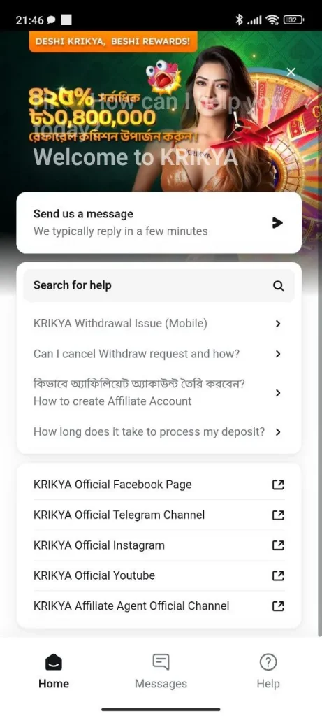Krikya ২৪/৭ কাস্টমার সাপোর্ট — একাধিক চ্যানেলে অ্যাক্সেস। লাইভ চ্যাট সবচেয়ে দ্রুত — ওয়েবসাইট বা অ্যাপে তাৎক্ষণিক সহায়তা; সাধারণ প্রশ্ন, অ্যাকাউন্ট বা টেকনিক্যাল সমস্যা দ্রুত সমাধান হয়। চ্যাট ইন্টারফেসে বাংলা ও ইংরেজি—লোকাল ব্যবহারকারীদের সুবিধা।