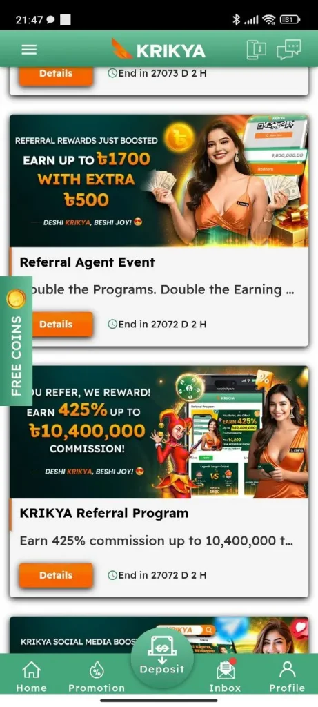 নিয়মিত প্রোমোশনের মধ্যে: প্রতিটি ডিপোজিটে ৫% ইনস্ট্যান্ট ক্যাশ, সাপ্তাহিক লাকি ড্র (টাকা ও গ্যাজেট পুরস্কার), সপ্তাহের ক্ষতিতে সর্বাধিক BDT ৬০,০০০ ক্যাশব্যাক। রিওয়ার্ড স্টোরে ডিপোজিট করে কয়েন জমিয়ে কুপন-পুরস্কার পাওয়া যায়; উইল অফ Krikya-তে BDT ৮৮,৮৮৮ পর্যন্ত ক্যাশ জেতার সুযোগ।