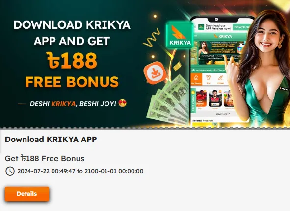 Krikya নতুন এবং পুরনো প্লেয়ার, সবার জন্য বিস্তৃত প্রোমো প্রোগ্রাম দেয়। বোনাস স্ট্রাকচার বিভিন্ন গেম পছন্দ অনুযায়ী আলাদা — ক্যাসিনো ও স্পোর্টসবেটিং-এ আলাদা অফার। সব বোনাসেই নির্দিষ্ট বাজির শর্ত—উইথড্রর আগে সেগুলো পূর্ণ করতে হবে।